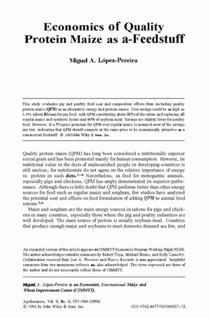 This study evaluates pig and poultry feed cost and composition effects from including quality protein maize (QPM) as an alternative energy and protein source. Cost savings could be as high as 3.4% (about $5/ton) for pig feed, with QPM constituting about 80% of the ration and replacing all regular maize and synthetic lysine and 40% of soybean meal. Savings are slightly lower for poultry feed. However, if a 5% price premium for QPM over regular maize is assumed most of the savings are lost, indicating that QPM should compete at the same price to be economically attractive as a commercial feedstuff.