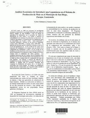 El ICTA inicio en 1989 un programa de investigacion destinado al desarrollo de tecnologias adecuadas para suelos de laderas, fragiles, de baja fertilidad o bajo un sistema de agricultura de subsistencia con el proposito de reducir la degradacion de estos suelos y asi ayudar a mantener la sostenibilidad de los sistemas de produccion en estas areas. Se evaluaron agronomica y economicamente tres leguminosas para ser intercaladas con el maiz a saber: Vigna unguiculata y Canavalia ensiformis y Mucuna en dos areas de Guatemala: Cuyuta (ciclos 1989-1990); y Zacapa (ciclos 1990-1991). La hipotesis prevaleciente para la evaluacion economica se baso en
