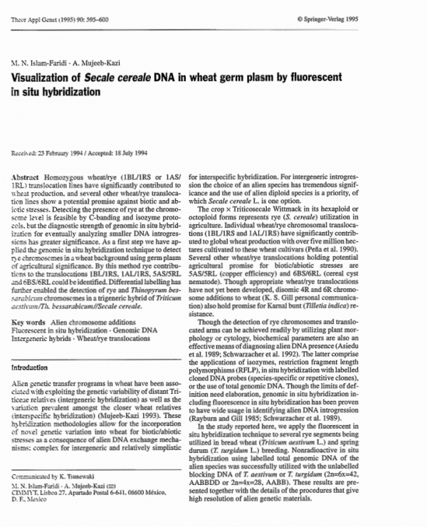 Visualization of Secale cereale DNA in wheat germ plasm by fluorescent in situ hybridization