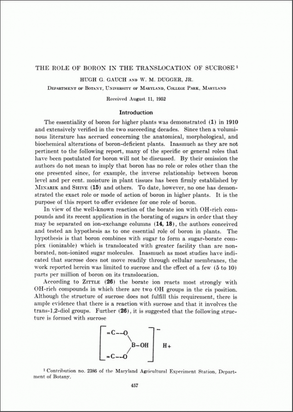 The essentiality of boron for higher plants was demonstrated (1) in 1910 and extensively verified in the two succeeding decades. Since then a voluminous literature has accrued concerning the anatomical, morphological, and biochemical alterations of boron-deficient plants. Inasmuch as they are not pertinent to the following report, many of the specific or general roles that have been postulated for boron will not be discussed. By their omission the authors do not mean to imply that boron has no role or roles other than the one presented since, for example, the inverse relationship between boron level and per cent. moisture in plant tissues has been firmly established by MIINARIK and SHIVE (15) and others. To date, however, no one has demionstrated the exact role or mode of action of boron in higher plants. It is the purpose of this report to offer evidence for one role of boron.