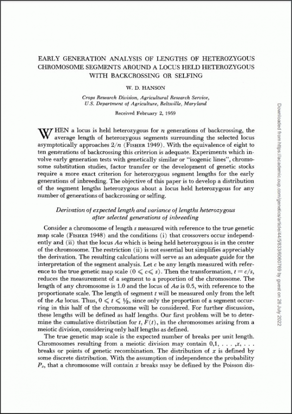 When a locus is held heterozygous for n generations of backcrossing, the average length of heterozygous segments surrounding the selected locus asymptotically approaches 2Jn (FISHER 1949). With the equivalence of eight to ten generations of backcrossing this criterion is adequate. Experiments which involve early generation tests with genetically similar or “isogenic lines”, chromosome substitution studies, factor transfer or the development of genetic stocks require a more exact criterion for heterozygous segment lengths for the early generations of inbreeding. The objective of this paper is to develop a distribution of the segment lengths heterozygous about a locus held heterozygous for any number of generations of backcrossing or selfing.