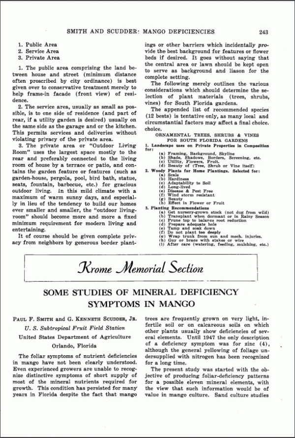 The present study was strated with the objective of producing foliar-deficiency patterns for a possible eleven mineral elements, with the view that such information would be of value in mango culture. Sand culture studies were started in the fall of 1947 and continued for about three years with partial success in distinguishing specific leaf symptoms of the various essential elements. The present report gives an outline of the study, along with pertinent description and illustrations of the leaf symptoms which developed and some discussion on the elements which failed to cause any foliar abormalities.