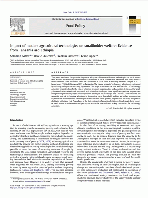 Subject(s): Online resources: In: Food Policy United Kingdom : Elsevier, 2012. v. 37, no. 3, p. 283-295Summary: This paper evaluates the potential impact of adoption of improved legume technologies on rural household welfare measured by consumption expenditure in rural Ethiopia and Tanzania. The study utilizes cross-sectional farm household level data collected in 2008 from a randomly selected sample of 1313 households (700 in Ethiopia and 613 in Tanzania). The causal impact of technology adoption is estimated by utilizing endogenous switching regression. This helps us estimate the true welfare effect of technology adoption by controlling for the role of selection problem on production and adoption decisions. Our analysis reveals that adoption of improved agricultural technologies has a significant positive impact consumption expenditure (in per adult equivalent terms) in rural Ethiopia and Tanzania. This confirms the potential role of technology adoption in improving rural household welfare as higher consumption expenditure from improved technologies translate into lower poverty, higher food security and greater ability to withstand risk. An analysis of the determinants of adoption highlighted inadequate local supply of seed, access to information and perception about the new cultivars as key constraints for technology adoption.
