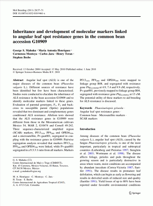 Angular leaf spot (ALS) is one of the major diseases of the common bean (Phaseolus vulgaris L.). Different sources of resistance have been identified but few have been characterized. Studies were conducted to elucidate the inheritance of ALS resistance in the bean accession G10909 and to identify molecular markers linked to these genes. Evaluation of parental genotypes, F1, F2 and backcross to susceptible parent (Sprite) populations revealed that two dominant and complementary genes conditioned ALS resistance. Allelism tests showed that the ALS resistance genes in G10909 were different from those in the Mesoamerican cultivars Mexico 54, MAR 2, G10474 and Cornell 49-242. Three sequence-characterized amplified region (SCAR) markers, PF13310, PF9260 and OPE04709, and a microsatellite, Pv-gaat001, segregated in coupling with the resistance genes in G10909. Pairwise segregation analysis revealed that markers PF13310, PF9260 and OPE04709 were linked, while Pv-gaat001 segregated in a 9:3:3:1 ratio from all markers. Markers PF13310, PF9260 and OPE04709 were mapped to linkage group B08, and segregated with resistance gene PhgG10909B at 4.9, 7.4 and 9.9 cM, respectively. Pv-gaat001, previously mapped to linkage group B04, segregated with resistance gene PhgG10909A at 13 cM. The potential utility of these markers to aid breeding for ALS resistance is discussed.