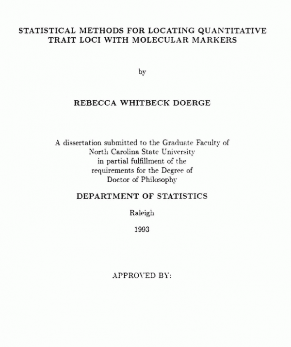 TextLanguage: English Publication details: Raleigh, NC (USA): North Carolina State University, 1993Description: xviii, 158 pagesSubject(s): Summary: Recent progress in molecular genetics has made it possible for scientists to gain a fine scale genetic map of various organisms. Such improvements in molecular genetics have been attained by placing genetic markers (RFLPs, isozymes, RAPDs) along a genome of interest. It is through these markers that an initial framework for inferences about quantitative trait loci (QTL) can be built. Quantitative traits are largely affected by an association of many genes, therefore the location which involves these quantitative traits cannot be described simply in the context of a typical genetic map scenario. Instead, a statistical representation of the quantitative trait serves to tell us how much of the genetic variation in the parental lines is contributed to the offspring by each region that is identified through genetic markers in the progeny. Statistical issues leading up to and including the search and location of quantitative trait loci are investigated. A preliminary method for ordering molecular markers is presented with the purpose of providing the fundamental structure involved in the search for QTL. In developing this method, issues of genetic maps, recombination, and assumptions of the mating scheme are investigated. The statistical theory supporting single marker and interval mapping methods for detecting and locating QTL is explored for the purpose of evaluating the robustness of these procedures. Lastly, a new method for detecting and locating QTL is described. Once QTL have been identified as being contained within a specific region of DNA this will allow for eventual molecular cloning and characterization of genes involved in quantitative inheritance.