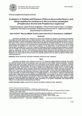 Root-lesion nematodes (RLN; Pratylenchus thornei and Pratylenchus neglectus) are serious plant parasitic nematodes that attack wheat roots and cause significant losses in grain quality and quantity worldwide. They are widely distributed in Turkish wheat growing areas and can be only controlled by growing resistant cultivars and non-host crops. There is no commercial available a wheat cultivar identified as completely resistant to RLN, so that, the breeding programs contain moderately resistant parents to incorporate this trait in high yielding adapted wheat germplasm. The objective of this research was to evaluate some Turkish wild Emmers (Triticum dicoccoides) and national spring wheat varieties for resistant to P. thornei and P. neglectus. In the experiments, 32 wild Emmers and 42 wheat cultivars were inoculated with P. thornei or P. neglectus individuals and grown under controlled conditions in a growth room for 9 weeks. The results showed that 25 and 35 wheat varieties were moderately resistant to P. thornei and P. neglectus, respectively. In total, 17 lines exhibiting multiple resistance reactions to both nematodes were in the same group with the check lines (P<0.05). The identified resistant wheat accessions showed improved levels of RLN resistance over current parents and could serve as an excellent genetic pool to be used in an efficient Turkish wheat-breeding programme.