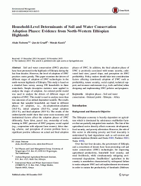 Soil and water conservation (SWC) practices have been promoted in the highlands of Ethiopia during the last four decades. However, the level of adoption of SWC practices varies greatly. This paper examines the drivers of different stages of adoption of SWC technologies in the north-western highlands of Ethiopia. This study is based on a detailed farm survey among 298 households in three watersheds. Simple descriptive statistics were applied to analyze the stages of adoption. An ordered probit model was used to analyze the drivers of different stages of adoption of SWC. This model is used to analyze more than two outcomes of an ordinal dependent variable. The results indicate that sampled households are found in different phases of adoption, i.e., dis-adoption/non-adoption (18.5 %), initial adoption (30.5 %), actual adoption (20.1 %), and final adoption (30.9 %). The results of the ordered probit model show that some socio-economic and institutional factors affect the adoption phases of SWC differently. Farm labor, parcel size, ownership of tools, training in SWC, presence of SWC program, social capital (e.g., cooperation with adjacent farm owners), labor sharing scheme, and perception of erosion problem have a significant positive influence on actual and final adoption phases of SWC. In addition, the final adoption phase of SWC is positively associated with tenure security, cultivated land sizes, parcel slope, and perception on SWC profitability. Policy makers should take into consideration factors affecting (continued) adoption of SWC such as profitability, tenure security, social capital, technical support, and resource endowments (e.g., tools and labor) when designing and implementing SWC policies and programs.