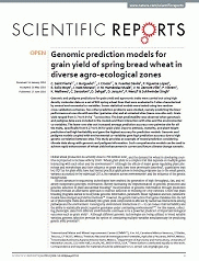 By: Contributor(s): Material type: ArticleLanguage: English Publication details: London : Nature Publishing Group, 2016.Subject(s): Online resources: In: Nature Scientific reports London : Nature Publishing Group, 2011- v. 6, no. 27312Summary: Genomic and pedigree predictions for grain yield and agronomic traits were carried out using high density molecular data on a set of 803 spring wheat lines that were evaluated in 5 sites characterized by several environmental co-variables. Seven statistical models were tested using two random cross-validations schemes. Two other prediction problems were studied, namely predicting the lines’ performance at one site with another (pairwise-site) and at untested sites (leave-one-site-out). Grain yield ranged from 3.7 to 9.0 t ha−1 across sites. The best predictability was observed when genotypic and pedigree data were included in the models and their interaction with sites and the environmental co-variables. The leave-one-site-out increased average prediction accuracy over pairwise-site for all the traits, specifically from 0.27 to 0.36 for grain yield. Days to anthesis, maturity, and plant height predictions had high heritability and gave the highest accuracy for prediction models. Genomic and pedigree models coupled with environmental co-variables gave high prediction accuracy due to high genetic correlation between sites. This study provides an example of model prediction considering climate data along-with genomic and pedigree information. Such comprehensive models can be used to achieve rapid enhancement of wheat yield enhancement in current and future climate change scenario.