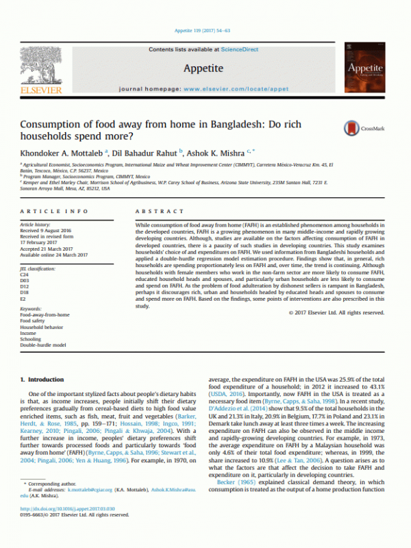 Appetite Amsterdam, Netherlands : Elsevier v. 119, p. 54-63Summary: While consumption of food away from home (FAFH) is an established phenomenon among households in developed countries, FAFH is a growing phenomenon in many middle-income and rapidly-growing developing countries. Although studies are available on the factors affecting consumption of FAFH in developed countries, there is a paucity of such studies in developing countries. This study examines households’ choice of and expenditures on FAFH. We used information from Bangladeshi households and applied a double-hurdle regression model estimation procedure. Findings show that, in general, rich households spend proportionately less on FAFH in a downward trend. Households with female members who work in the non-farm sector are more likely to consume FAFH. Similarly, educated household heads and spouses, and urban households are less likely to consume FAFH and spend less on it. Perhaps the problem of food adulteration by dishonest sellers in Bangladesh is discouraging rich, urban and households headed by educated heads and spouses from consuming more and they are spending less on FAFH. Based on the findings, some points of intervention are prescribed in this study.
