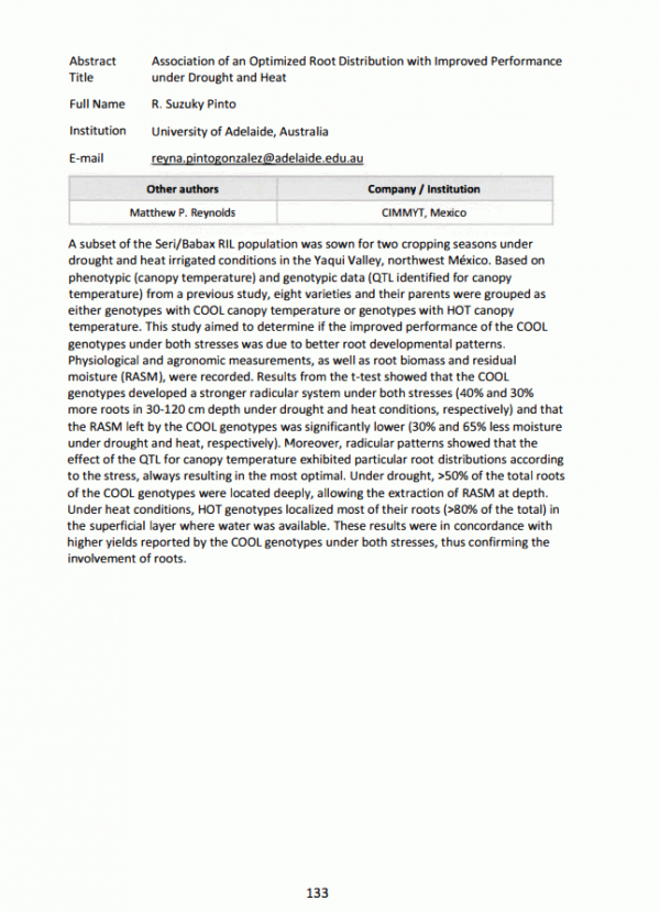 Pinto R.S, Reynolds M.P and Borlaug Summit on Wheat for Food Security. Association of an optimized root distribution with improved performance under drought and heat. Mexico, D.F. (Mexico): CIMMYT. 2014.