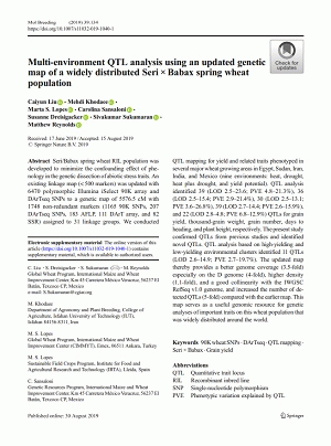 Seri/Babax spring wheat RIL population was developed to minimize the confounding effect of phenology in the genetic dissection of abiotic stress traits. An existing linkage map (< 500 markers) was updated with 6470 polymorphic Illumina iSelect 90K array and DArTseq SNPs to a genetic map of 5576.5 cM with 1748 non-redundant markers (1165 90K SNPs, 207 DArTseq SNPs, 183 AFLP, 111 DArT array, and 82 SSR) assigned to 31 linkage groups. We conducted QTL mapping for yield and related traits phenotyped in several major wheat growing areas in Egypt, Sudan, Iran, India, and Mexico (nine environments: heat, drought, heat plus drought, and yield potential). QTL analysis identified 39 (LOD 2.5?23.6; PVE 4.8?21.3%), 36 (LOD 2.5?15.4; PVE 2.9?21.4%), 30 (LOD 2.5?13.1; PVE 3.6?26.8%), 39 (LOD 2.7?14.4; PVE 2.6?15.9%), and 22 (LOD 2.8?4.8; PVE 6.8?12.9%) QTLs for grain yield, thousand-grain weight, grain number, days to heading, and plant height, respectively. The present study confirmed QTLs from previous studies and identified novel QTLs. QTL analysis based on high-yielding and low-yielding environmental clusters identified 11 QTLs (LOD 2.6?14.9; PVE 2.7?19.7%). The updated map thereby provides a better genome coverage (3.5-fold) especially on the D genome (4-fold), higher density (1.1-fold), and a good collinearity with the IWGSC RefSeq v1.0 genome, and increased the number of detected QTLs (5-fold) compared with the earlier map. This map serves as a useful genomic resource for genetic analyses of important traits on this wheat population that was widely distributed around the world.
