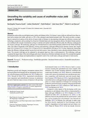 Ethiopia has achieved the second highest maize yield in sub-Saharan Africa. Yet, farmers’ maize yields are still much lower than on-farm and on-station trial yields, and only ca. 20% of the estimated water-limited potential yield. This article provides a comprehensive national level analysis of the drivers of maize yields in Ethiopia, by decomposing yield gaps into efficiency, resource and technology components, and accounting for a broad set of detailed input and crop management choices. Stochastic frontier analysis was combined with concepts of production ecology to estimate and explain technically efficient yields, the efficiency yield gap and the resource yield gap. The technology yield gap was estimated based on water-limited potential yields from the Global Yield Gap Atlas. The relative magnitudes of the efficiency, resource and technology yield gaps differed across farming systems; they ranged from 15% (1.6 t/ha) to 21% (1.9 t/ha), 12% (1.3 t/ha) to 25% (2.3 t/ha) and 54% (4.8 t/ha) to 73% (7.8 t/ha), respectively. Factors that reduce the efficiency yield gap include: income from non-farm sources, value of productive assets, education and plot distance from home. The resource yield gap can be explained by sub-optimal input use, from a yield perspective. The technology yield gap comprised the largest share of the total yield gap, partly due to limited use of fertilizer and improved seeds. We conclude that targeted but integrated policy design and implementation is required to narrow the overall maize yield gap and improve food security.