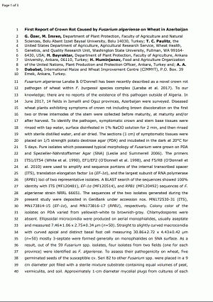 First report of crown rot caused by Fusarium algeriense on wheat in Azerbaijan