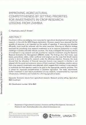 Countries in Africa are pledging more resources for agricultural development and agricultural research, in line with the 2003 Maputo declaration. However, experts have reasoned that the quantity of resources is as important as the quality of spending. If resources are allocated efficiently, more could be achieved with the same resources. Ensuring an effective strategy and basis for prioritising crop research investments so as to improve productivity is a major challenge in Zambia and other African countries. This study investigates the economic returns of investment in crop research and sets priorities for research investment using the Dynamic Research Evaluation for Management (DREAM) model. The findings show that maize, soya beans, groundnuts, cotton, millet, sunflower and sorghum are the crops that should receive priority in terms of funding for research under the efficiency objective. However, the study showed that the allocation of financial resources towards crop research in Zambia is not aligned with the social and economic returns of that investment. Nonetheless, positive returns from crop research investments were obtained, which suggests that investing in crop research is worthwhile but that attention needs to be paid to the appropriate research priorities. This is critical for improved competitiveness in Zambian agriculture. The study recommends further investment in and robust prioritisation of crop research, complemented by improved infrastructure, institutions and markets for a thriving agricultural sector.