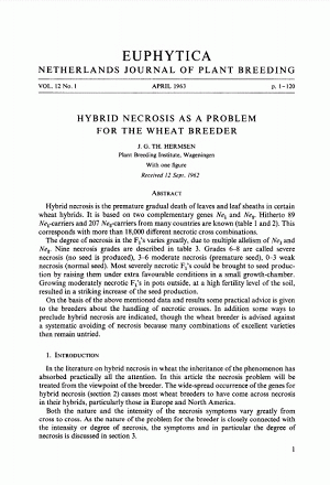 Hybrid necrosis is the premature gradual death of leaves and leaf sheaths in certain wheat hybrids. It is based on two complementary genes Ne 1 and Ne 2. Hitherto 89 Ne 1-carriers and 207 Ne 2-carriers from many countries are known (table 1 and 2). This corresponds with more than 18,000 different necrotic cross combinations. The degree of necrosis in the F1's varies greatly, due to multiple allelism of Ne 1 and Ne 2. Nine necrosis grades are described in table 3. Grades 6–8 are called severe necrosis (no seed is produced), 3–6 moderate necrosis (premature seed), 0–3 weak necrosis (normal seed). Most severely necrotic F1's could be brought to seed production by raising them under extra favourable conditions in a small growth-chamber. Growing moderately necrotic F1's in pots outside, at a high fertility level of the soil, resulted in a striking increase of the seed production. On the basis of the above mentioned data and results some practical advice is given to the breeders about the handling of necrotic crosses. In addition some ways to preclude hybrid necrosis are indicated, though the wheat breeder is advised against a systematic avoiding of necrosis because many combinations of excellent varieties then remain untried.