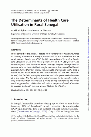 Subject(s): In: Journal of African Economies United Kingdom : Oxford University Press, 2013. v. 22, no. 1, p. 163-186Summary: In the context of the national debate on the extension of health insurance to farming households in Senegal, information on 504 households and 18 public primary health care (PHC) facilities was collected to analyse health care utilisation in an area where people live on 1.17 USD per day and where only 6% have health insurance coverage. Despite the high level of poverty, 84% of the individuals sought treatment from a qualified health provider during their last illness. The high rate of utilisation in the area is found to be attributable to the characteristics of the PHC facilities. Indeed, PHC facilities are highly accessible and offer good medical services at a low price. The low price of medical services in the sample explains why the demand for curative care is found to be price-inelastic. This latter result suggests that policies that will reduce the price of medical services to increase the health care use are not likely to be effective.