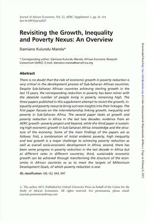 There is no doubt that the role of economic growth in poverty reduction is very critical in the development process of Sub-Saharan African countries. Despite Sub-Saharan African countries achieving sterling growth in the last 15 years, the corresponding reduction in poverty has been minor with the absolute number of people living in poverty remaining high. The three papers published in this supplement attempt to revisit the growth, inequality and poverty nexus to bring out new insights into their linkages. The first paper focuses on the interrelationship linking growth, inequality and poverty in Sub-Saharan Africa. The second paper looks at growth and poverty reduction in Africa in the last two decades: evidence from an AERC growth–poverty project and beyond, while the third paper is sustaining high economic growth in Sub-Saharan Africa: knowledge and the structure of the economy. Some of the main findings of the papers are as follows: first, a combination of initial endemic poverty, high inequality and low growth is a major challenge to achieving poverty reduction as well as overall socio-economic development in Africa; second, there has been some progress in poverty reduction in the last decade in Africa but at different rates in different countries; third, sustainable economic growth can be achieved through transforming the structure of the economies in African countries so as to meet the targets of Millennium Development Goals, of which poverty reduction is one.