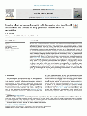 The paper refers to spring wheat breeding for potential yield, yield in the absence of manageable stresses, under irrigated low latitude conditions, representing a major environment for wheat production. Initially it discusses two propositions both over 50 years old. Donald argued that for greater yield, early generation selection should target uncompetitive plant traits or ?communal? plants. In contrast, Fasoulas proposed the opposite, namely selection of plants with high yield under nil-competition, aided by the use of a honeycomb design to control for soil variation. Despite some promising results, the absence of definitive proof of the relevance to yield breeding of either concept, wheat breeders have generally opted for an intermediate approach with focus on measuring yield in plots as early as possible. They have been successful but yield progress is slowing. The advent of seeding machinery permitting regular planting patterns through seed singulation, and the reporting of optimal densities for maximum yield per hectare as low as 20 plants/m2 under irrigation and excellent management in northwest Mexico (Fischer et al., 2019), suggest that Fasoulas's method needs reinvestigating at least for wheat. Yield crossovers (i.e. genotype rank changes) with increasing plant density from the very low density for nil-competition (around 1.4/m2) are expected to be less likely if the target crop density is as low as say 20/m2. There are enough unknowns in the physiology of the wheat crop response to density to suggest that this is quite possible. The approach opens up new possibly more efficient strategies for early generation (e.g. F2) selection for potential yield and could give greater yield progress per unit cost. It would be especially suited for hybrid wheat breeding and production systems. Finally the paper discusses, in the light of the advances in precision agriculture, the opportunities for the agronomy of crops and breeding-nurseries based on low-density honeycomb planting. The major challenge, namely weed control, is manageable.