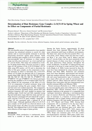Subject(s): In: Journal of Phytopathology United Kingdom : Wiley, 2012. v. 160, no. 11-12, p. 628-636Summary: The non‐durable nature of hypersensitive (race‐specific) resistance has stimulated scientists to search for other options such as race‐non‐specific resistance to provide long‐lasting protection against plant diseases. Adult plant resistance gene complex Lr34/Yr18 confers a dual race‐non‐specific type of resistance to wheat against stripe rust (Puccinia striiformis f. sp. tritici) and leaf rust (P. triticina Eriks). This study was conducted to evaluate 59 spring bread wheat (Triticum aestivum L.) genotypes for the presence of the Lr34/Yr18‐linked csLV34 allele using STS marker csLV34 and to determine the effect of this gene complex on the components of partial resistance in wheat to leaf/stripe rust. Lr34/Yr18‐linked csLV34 allele was detected only in 12 genotypes, namely Iqbal 2000, NR‐281, NR 354, NR 363, NR 364, NR 366, NR 367, NR 370, NR 376, 4thEBWYT 509, 4thEBWYT 510 and 4thEBWYT 518. Eleven genotypes showing the amplified Lr34/Yr18‐linked allele were further studied for the assessment of the effect of Lr34/Yr18 on components of partial resistance along with nine genotypes lacking this gene complex. Both stripe and leaf rusts were studied separately. The components of partial resistance including latency period (LP) and infection frequency (IF) were studied on primary leaf (seedling stage), fourth leaf and fully expanded young flag leaf (adult plant stage). Both the stripe and leaf rust fungi showed a prolonged LP and reduced IF on genotypes carrying Lr34/Yr18 gene complex. Generally, a longer LP was associated with a reduced IF at all growth stages. Although significant effect of Lr34/Yr18 gene complex on LP and IF was observed almost at all three growth stages, the effect was more pronounced at flag leaf. This suggested that Lr34/Yr18 gene complex is more effective at later stages of plant growth.