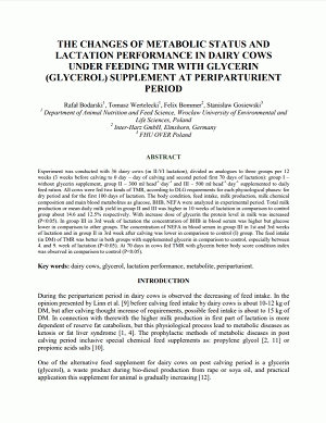 The changes of metabolic status and lactation performance in dairy cows under feeding TMR with glycerin (glycerol) supplement at periparturient period