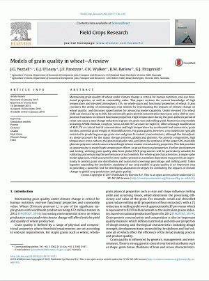 Subject(s): Online resources: In: Field Crops Research Amsterdam (Netherlands) : Elsevier, 2017. v. 202, p. 136-145Summary: Maintaining grain quality of wheat under climate change is critical for human nutrition, end-use functional properties, as well as commodity value. This paper reviews the current knowledge of high temperature and elevated atmospheric CO2 on whole-grain and functional properties of wheat. It also considers the utility of contemporary crop models for investigating the impacts of climate change on wheat quality; and discusses opportunities for advancing model capability. Under elevated CO2 wheat yield can increase by up to 36%, but universally grain protein concentration decreases and a shift in composition translates to reduced functional properties. High temperature during the post-anthesis period of crops can cause a step change reduction in grain-set, grain size and milling yield. Numerous crop models including APSIM-Nwheat, CropSyst, Sirius, GLAM-HTS account for high CO2 effects through modification of RUE, TE or critical leaf-N concentration and high temperature by accelerated leaf senescence, grain number, potential grain weight or HI modifications. For grain quality, however, crop models are typically restricted to predicting average grain size and grain-N content (concentration), although the SiriusQuality model accounts for the major storage proteins, gliadin and glutenin. For protein composition, high temperature stress reduces the glutenin/gliadin ratio and limits the synthesis of the larger SDS-insoluble glutenin polymers which causes wheat dough to have weaker viscoelasticity properties. This link provides an opportunity to model high temperature effects on grain functional properties. Further development and testing, utilizing grain quality data from global FACE programmes will be particularly valuable for validating and enhancing the performance of such models. For whole-grain characteristics, a single-spike model approach, which accounts for intra-spike variation in assimilate deposition may provide an opportunity to predict grain size distribution and associated screenings percentage and milling yield. Taken together expanding the predictive capability of our crop models to grain quality is an important step in providing a powerful tool for developing adaptation strategies for combating the impacts of climate change to global crop production and grain quality.