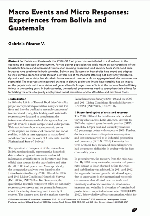 Subject(s): In: IDS Bulletin United Kingdom : Wiley, 2015. v. 46, no. 6, p. 45-52Summary: For Bolivia and Guatemala, the2007–08 food price crisis contributed to a slowdown in the economy and increased unemployment. For the poorer population the crisis meant an overstretching of the household finances and increased difficulties for ensuring household food security. Since 2010, food price increases have continued in both countries. Bolivian and Guatemalan households have coped and adapted to their current economic stress through a diverse set of mechanisms affecting not only family structures, dynamics and productivity, but also their future economic prospects. At an aggregate level, the outcomes are substantial. The reported and measured changes in dietary quality and intake have certainly had an impact on the population's nutritional status and general health. Longer‐term effects at the national level will likely follow in the coming years. In both countries, the national governments need to strengthen their efforts for facilitating the access to quality employment, social protection, and to affordable and nutritious foods.