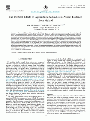 Across sub-Saharan Africa agricultural subsidy programs have again become a common strategy for combatting rural poverty, increasing agricultural production, and reducing food insecurity. Despite a large literature examining subsidies’ effects on output and welfare, little is known about their political effects. This paper examines Malawi’s Agricultural Input Subsidy Programme, one of the largest and most expensive programs implemented, which was launched by the government in 2005. We examine whether the incumbent party, the Democratic Progressive Party headed by president Bingu wa Mutharika, benefited from Malawi’s subsidy program by examining a longitudinal dataset of 1,846 rural Malawians interviewed in 2008 and again in 2010. The individual-level data show no evidence that the subsidy program was targeted to Mutharika’s co-ethnics or co-partisans. Our analysis further demonstrates that the subsidy program increased support for the incumbent party. These results suggest that even when parties are unable or unwilling to target distributional programs at the local level, they may nonetheless derive political benefits. As anti-poverty programs—including agricultural subsidies to small-scale farmers—become increasingly common across the continent, our results suggest that they may help to explain patterns of party affiliation and vote choice, particularly where traditional patterns of partisan affiliation related to ethnic or regional identities are weak.