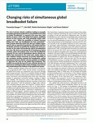The risk of extreme climatic conditions leading to unusually low global agricultural production is exacerbated if more than one global ‘breadbasket’ is exposed at the same time. Such shocks can pose a risk to the global food system, amplifying threats to food security, and could potentially trigger other systemic risks1,2. While the possibility of climatic extremes hitting more than one breadbasket has been postulated3,4, little is known about the actual risk. Here we combine region-specific data on agricultural production with spatial statistics of climatic extremes to quantify the changing risk of low production for the major food-producing regions (breadbaskets) over time. We show an increasing risk of simultaneous failure of wheat, maize and soybean crops across the breadbaskets analysed. For rice, risks of simultaneous adverse climate conditions have decreased in the recent past, mostly owing to solar radiation changes favouring rice growth. Depending on the correlation structure between the breadbaskets, spatial dependence between climatic extremes globally can mitigate or aggravate the risks for the global food production. Our analysis can provide the basis for more efficient allocation of resources to contingency plans and/or strategic crop reserves that would enhance the resilience of the global food system.