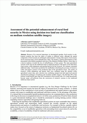 Subject(s): Online resources: In: IOP Conference Series: Earth and Environmental Science United Kingdom : IOP Publishing, 2017. v. 54, art. 012006Summary: Because of its renewed importance in international agendas, food security in sub-tropical countries has been the object of studies at different scales, although the spatial components of food security are still largely undocumented. Among other aspects, food security can be assessed using a food selfsufficiency index. We propose a spatial representation of this assessment in the densely populated rural area of the Huasteca Poblana, Mexico, where there is a known tendency towards the loss of selfsufficiency of basic grains. The main agricultural systems in this area are the traditional milpa (a multicrop practice with maize as the main basic crop) system, coffee plantations and grazing land for bovine livestock. We estimate a potential additional milpa - based maize production by smallholders identifying the presence of extensive coffee and pasture systems in the production data of the agricultural census. The surface of extensive coffee plantations and pasture land were estimated using the detailed coffee agricultural census data, and a decision tree combining unsupervised and supervised spectral classification techniques of medium scale (Landsat) satellite imagery. We find that 30% of the territory would benefit more than 50% increment in food security and 13% could theoretically become maize self-sufficient from the conversion of extensive systems to the traditional multicrop milpa system.