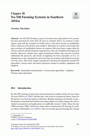 No-till (NT) farming, as part of a Conservation Agriculture (CA) system, has been practiced for more than 30 years in southern Africa. In contrast to other regions, and with the exception of South Africa, it has been mostly on smallholder farms, which are more diverse and complex. Tailoring CA systems to the needs and agro-ecologies of smallholder farmers in southern Africa has been a major effort by various research and development organizations with a lot of publicized biophysical benefits. However, despite these large promotional efforts and research to better understand the processes and merits of applying the basic principles of CA, its adoption has so far remained low given the large investments and attention received over the years. This book chapter summarizes historical developments around NT agriculture, current status and future directions needed to enhance adaptation and adoption.
