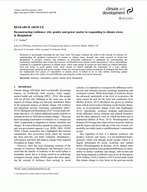 Resilience is increasingly becoming the new buzz word. This paper examines the utility of the concept of resilience for understanding the gendered experiences of women to climate stress, through case study research in South-west Bangladesh. It provides evidence that resilience, as commonly understood, is inadequate for understanding the intersecting vulnerabilities that women face because of embedded socio-cultural norms and practices. These vulnerabilities culminate in a gendered experience of climate stress, where some groups of women are more likely go without education, food and access to good quality water. Such circuits of control highlight the importance of a more radical, transformational, gendered and power sensitive frame for moving beyond coping mechanisms to strategies that deal with the fundamental root causes of vulnerability to climate stress. A failure to do so risks further reinforcing gender inequalities due to the reality of social difference and inequities within local power structures.