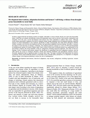 Evidence suggests that the developing countries are highly vulnerable to various climatic shocks now and in the foreseeable future, while they are already encountering various developmental issues such as poverty, food security, malnutrition and inequality. Over the years, several development interventions have been undertaken to address these issues. Although recent studies particularly emphasize the need to integrate climate change adaptation into development planning, empirical analysis of causal relationships is less explored, specifically in India. Consequently, this study firstly attempts to identify whether synergies exist between development activities and agricultural adaptation decision-making. Secondly, it assesses the impact of such decisions on farmers’ well-being. The empirical analysis is based on a survey of 549 rural households in drought-prone regions of western Odisha, India, where western Orissa rural livelihoods project was implemented in the last decade to improve the living standards. Using an ‘endogenous switching regression approach’, this study reveals two findings. Firstly, livelihood interventions enhance the likelihood of undertaking farm-level adaptation measures, and the other drivers are access to technical education, formal and informal institutions and agricultural extension services. Secondly, adaptations lead to significant gains in income from crops. The paper concludes with implications for policies to promote various rural livelihoods projects in rural India. From a broader policy perspective, it is imperative to integrate climate change in development planning to reduce the risk of maladaptation.