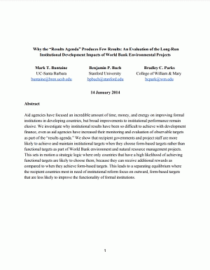 Aid agencies have focused an incredible amount of time, money, and energy on improving formal institutions in developing countries, but broad improvements to institutional performance remain elusive. We investigate why institutional results have been so difficult to achieve with development finance, even as aid agencies have increased their monitoring and evaluation of observable targets as part of the “results agenda.” We show that recipient governments and project staff are more likely to achieve and maintain institutional targets when they choose formbased targets rather than functional targets as part of World Bank environment and natural resource management projects. This sets in motion a strategic logic where only countries that have a high likelihood of achieving functional targets are likely to choose them, because they can receive additional rewards as compared to when they achieve formbased targets. This leads to a separating equilibrium where the recipient countries most in need of institutional reform focus on outward, formbased targets that are less likely to improve the functionality of formal institutions.