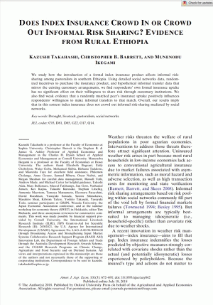 We study how the introduction of a formal index insurance product affects informal risk-sharing among pastoralists in southern Ethiopia. Using detailed social networks data, randomized incentives to purchase the insurance product, and hypothetical informal transfer data that mirror the existing customary arrangements, we find respondents’ own formal insurance uptake has no significant effect on their willingness to share risk through customary institutions. We also find weak evidence that a randomly matched peer's insurance uptake positively influences respondents’ willingness to make informal transfers to that match. Overall, our results imply that in this context index insurance does not crowd out informal risk-sharing mediated by social networks.