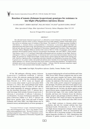 Subject(s): In: Indian Journal of Agricultural Sciences New Delhi (India) : Indian Council of Agricultural Research, 2017. v. 87, no. 10, p. 1358-1364Summary: The cultivated tomato (Solanum lycopersicum L.) is affected by several of diseases of which late blight, caused by Phytophthora infestans ((Mont.) de Bary), being the most severe under epidemic condition. Wild tomato species have proven as continuing source of resistance to this disease. The reaction of 152 tomato genotypes including 4 wild relatives, i.e. Solanum chilense, S. pimpenellifolium, S. cheesmaniae, S. peruvianum, against late blight was determined using whole-plant scoring. These genotypes were screened and evaluated in two different conditions (open field and side open poly house) at the Department of Horticulture (Vegetable and Floriculture), Bihar Agricultural University, Sabour, Bhagalpur (Bihar) in autumn-winter season of 2013-14. Of the 152 genotypes, none of the test genotypes showed immune reaction. Moreover, the genotypes Arka Rakshak, Arka Alok, BRDT-1, Kashi Anupam, Arka Ananya, Azad T-5, C 6 T and Kashi Vishesh high yield potential and lower incidence for late blight. Moreover, wild species S. chilense, S. pimpenellifolium, S. cheesmaniae and S. peruvianum showed resistance reaction for late blight. The genotype EC 538380 showed highly resistant disease reaction against late blight besides bearing more fruits. Moreover, significant effect of temperature and relative humidity was established on occurrence late of blight. In general cool, wet, cloudy weather with rainfall and ambient relative humidity favour late blight development and natural epidemics of P. infestans in the field which can be useful in screening large populations. The highest disease infestation and severity occurred during the month of January-February when the maximum temperature ranged from 10.4-10.8°C and maximum relative humidity ranged from 90-95%.