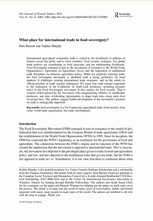 International agricultural commodity trade is central to the livelihoods of millions of farmers across the globe, and to most countries' food security strategies. Yet global trade policies are contributing to food insecurity and are undermining livelihoods. Food Sovereignty emerged in part as the articulation of resistance to the World Trade Organization's Agreement on Agriculture (AoA) and the imposition of multilateral trade disciplines on domestic agriculture policy. While not explicitly rejecting trade, the food sovereignty movement is identified with a strong preference for local markets. It challenges existing international trade structures, and on the whole its official position on trade remains ambiguous. We argue that trade remains important to the realization of the livelihoods of small-scale producers, including peasants active in the Food Sovereignty movement. It also matters for food security. That it remains underexplored by the movement risks marginalizing millions of smallholder producers, and risks overlooking opportunities to shape trade rules along more food sovereign lines. The authors suggest further development of the movement's position on trade is strategically important.