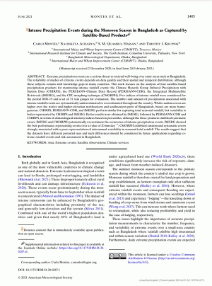 Subject(s): Online resources: In: Journal of Hydrometeorology USA : AMS, 2021. v. 22, no. 6, p. 1405-1419Summary: Extreme precipitation events are a serious threat to societal well-being over rainy areas such as Bangladesh. The reliability of studies of extreme events depends on data quality and their spatial and temporal distribution, although these subjects remain with knowledge gaps in many countries. This work focuses on the analysis of four satellite-based precipitation products for monitoring intense rainfall events: the Climate Hazards Group Infrared Precipitation with Station Data (CHIRPS), the PERSIANN–Climate Data Record (PERSIANN-CDR), the Integrated Multisatellite Retrievals (IMERG), and the CPC morphing technique (CMORPH). Five indices of intense rainfall were considered for the period 2000–19 and a set of 31 rain gauges for evaluation. The number and amount of precipitation associated with intense rainfall events are systematically underestimated or overestimated throughout the country. While random errors are higher over the wetter and higher-elevation northeastern and southeastern parts of Bangladesh, biases are more homogeneous. CHIRPS, PERSIANN-CDR, and IMERG perform similar for capturing total seasonal rainfall, but variability is better represented by CHIRPS and IMERG. Better results were obtained by IMERG, followed by PERSIANN-CDR and CHIRPS, in terms of climatological intensity indices based on percentiles, although the three products exhibited systematic errors. IMERG and CMORPH systematically overestimate the occurrence of intense precipitation events. IMERG showed the best performance representing events over a value of 20 mm day−1; CMORPH exhibited random and systematic errors strongly associated with a poor representation of interannual variability in seasonal total rainfall. The results suggest that the datasets have different potential uses and such differences should be considered in future applications regarding extreme rainfall events and risk assessment in Bangladesh.