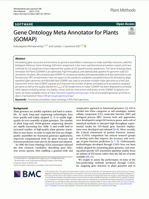 Subject(s): Online resources: In: Plant Methods London (United Kingdom) : BioMed Central, 2021. v. 17, art. 54Summary: Annotating gene structures and functions to genome assemblies is necessary to make assembly resources useful for biological inference. Gene Ontology (GO) term assignment is the most used functional annotation system, and new methods for GO assignment have improved the quality of GO-based function predictions. The Gene Ontology Meta Annotator for Plants (GOMAP) is an optimized, high-throughput, and reproducible pipeline for genome-scale GO annotation of plants. We containerized GOMAP to increase portability and reproducibility and also optimized its performance for HPC environments. Here we report on the pipeline’s availability and performance for annotating large, repetitive plant genomes and describe how GOMAP was used to annotate multiple maize genomes as a test case. Assessment shows that GOMAP expands and improves the number of genes annotated and annotations assigned per gene as well as the quality (based on Fmax) of GO assignments in maize. GOMAP has been deployed to annotate other species including wheat, rice, barley, cotton, and soy. Instructions and access to the GOMAP Singularity container are freely available online at https://bioinformapping.com/gomap/. A list of annotated genomes and links to data is maintained at https://dill-picl.org/projects/gomap/.