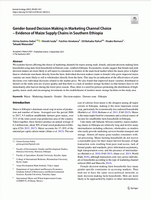 We examine factors affecting the choice of marketing channels for maize among male, female, and joint decision-making farm households using data from households in Dawuro zone, southern Ethiopia. Econometric results suggest that female and joint decision-makers are more likely to sell maize to consumers or retailers in the main local market where the maize price is higher than to wholesale merchants directly from the farm. Individual decision-makers (male or female) who grow improved maize varieties are more likely to sell to wholesalers directly from the farm. This may be an indication of the effectiveness of joint decisions over individual decisions related to the market price. We also found that improved maize varieties distributed to farmers in the study area are of poor quality and that there is a lack of modern storage facilities so that farmers have to sell immediately after harvest during the lower price season. Thus, there is a need for policies promoting the distribution of high-quality maize seeds and encouraging investments in the establishment of modern maize storage facilities in the study area.