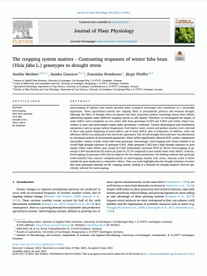 Subject(s): Online resources: In: Journal of Plant Physiology Netherlands : Elsevier, 2021. v. 263, art. 153463Summary: Intercropping of legumes and cereals provides many ecological advantages and contributes to a sustainable agriculture. These agricultural systems face ongoing shifts in precipitation patterns and seasonal drought. Although the effect of drought stress on legumes has been frequently studied, knowledge about water deficits influencing legumes under different cropping systems is still limited. Therefore, we investigated the impact of water deficit and re-irrigation on two winter faba bean genotypes (S_004 and S_062) and winter wheat (var. Genius) in pure and intercropped stands under greenhouse conditions. Various physiological and biochemical parameters, such as canopy surface temperature, leaf relative water content and proline content, were collected at three time points (beginning of water deficit, end of water deficit, after re-irrigation). In addition, water use efficiency (WUE) was analyzed at the end of the experiment. The overall drought stress tolerance was determined as conceptual analysis of all measured parameters. Water deficit significantly affected WUE, surface temperature and proline content of both winter faba bean genotypes. Interestingly, intercropping with wheat resulted in an overall high drought tolerance of genotype S_004, while genotype S_062 had a high drought tolerance in pure stands. Under water deficit, pure stands of S_062 substantially increased WUE by 30.5%. Intercropping of genotype S_004 increased the dry matter per plant by 31.7% compared to pure stands under water deficit. Contrary, intercropping of genotype S_062 did not improve the dry matter production. Our findings indicate that genotype S_004 benefits from resource complementarity in intercropping systems with wheat, whereas S_062 is better suitable for pure stands due to competitive effects. Thus, our study highlights that the drought tolerance of winter faba bean genotypes depends on the cropping system, leading to a demand for drought-adapted cultivars specifically selected for intercropping.