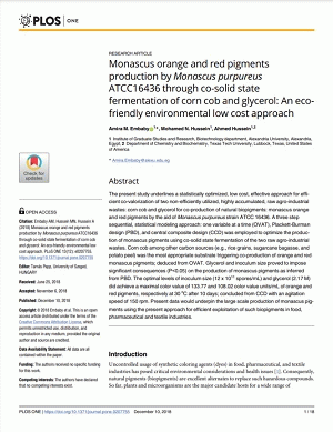 Monascus orange and red pigments production by Monascus purpureus ATCC16436 through co-solid state fermentation of corn cob and glycerol : an eco-friendly environmental low cost approach