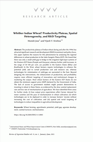 Subject(s): In: Review of Agrarian Studies India : Foundation for Agrarian Studies, 2021 v. 111, no. 1, p. 22-47Summary: The productivity plateau of Indian wheat during and after the 1990s has attracted significant research and development (R&D) investment and policy focus. Our paper explores the reasons for this phenomenon by analysing the regional differences in wheat production in the Indo-Gangetic Plains (IGP). We found that there was only a small yield gap to bridge in the irrigated, high-input systems of the Western IGP States (Punjab and Haryana), whereas further yield increases, in the range of 50–100 per cent, are possible in the Eastern States (Bihar and Jharkhand). In the West, wheat farmers require technologies to enhance the potential yield, and to curtail production cost and resource use, whereas technologies for minimisation of yield-gap are warranted in the East. Beyond designing the interventions, the enhancement of productivity and profitability requires more efficient targeting of innovations and institutional changes in marketing the output. Most wheat farmers of the Eastern IGP States do not obtain the minimum support price (MSP) declared by the Government of India. The lack of access to government markets might present disincentives to investing in wheat in these States, as evidenced by the slow varietal replacement rate and low rate of mechanisation of agriculture. We have identified three areas for further study: (i) how output price expectations affect farmer demand for newer varieties and the pace of mechanisation in wheat cultivation; (ii) which technologies are to be deployed in order to increase farmers’ income without increasing the cost of cultivation; and (iii) spatial and social targeting of technologies to reduce inequalities in agricultural development.