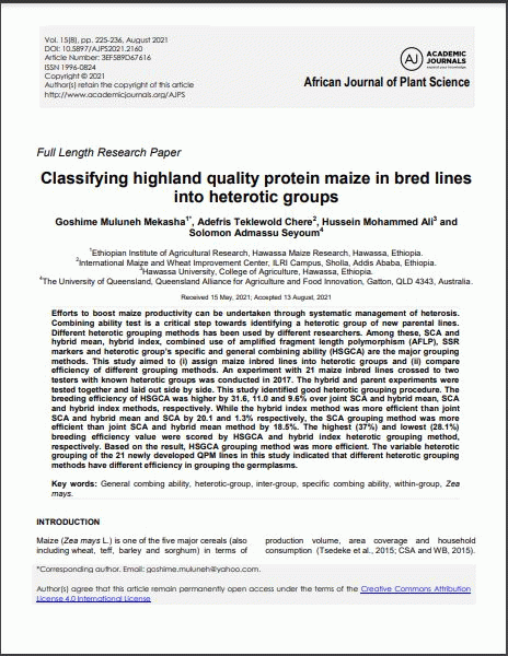 Efforts to boost maize productivity can be undertaken through systematic management of heterosis. Combining ability test is a critical step towards identifying a heterotic group of new parental lines. Different heterotic grouping methods has been used by different researchers. Among these, SCA and hybrid mean, hybrid index, combined use of amplified fragment length polymorphism (AFLP), SSR markers and heterotic group’s specific and general combining ability (HSGCA) are the major grouping methods. This study aimed to (i) assign maize inbred lines into heterotic groups and (ii) compare efficiency of different grouping methods. An experiment with 21 maize inbred lines crossed to two testers with known heterotic groups was conducted in 2017. The hybrid and parent experiments were tested together and laid out side by side. This study identified good heterotic grouping procedure. The breeding efficiency of HSGCA was higher by 31.6, 11.0 and 9.6% over joint SCA and hybrid mean, SCA and hybrid index methods, respectively. While the hybrid index method was more efficient than joint SCA and hybrid mean and SCA by 20.1 and 1.3% respectively, the SCA grouping method was more efficient than joint SCA and hybrid mean method by 18.5%. The highest (37%) and lowest (28.1%) breeding efficiency value were scored by HSGCA and hybrid index heterotic grouping method, respectively. Based on the result, HSGCA grouping method was more efficient. The variable heterotic grouping of the 21 newly developed QPM lines in this study indicated that different heterotic grouping methods have different efficiency in grouping the germplasms.