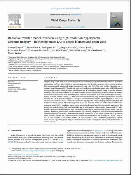 Subject(s): Online resources: In: Field Crops Research Amsterdam (Netherlands) : Elsevier, 2022. v. 282, art. 108449Summary: Mapping crop within-field yield variability provide an essential piece of information for precision agriculture applications. Leaf Area Index (LAI) is an important parameter that describes maize growth, vegetation structure, light absorption and subsequently maize biomass and grain yield (GY). The main goal for this study was to estimate maize biomass and GY through LAI retrieved from hyperspectral aerial images using a PROSAIL model inversion and compare its performance with biomass and GY estimations through simple vegetation index approaches. This study was conducted in two separate maize fields of 12 and 20 ha located in north-west Mexico. Both fields were cultivated with the same hybrid. One field was irrigated by a linear pivot and the other by a furrow irrigation system. Ground LAI data were collected at different crop growth stages followed by maize biomass and GY at the harvesting time. Through a weekly/biweekly airborne flight campaign, a total of 19 mosaics were acquired between both fields with a micro-hyperspectral Vis-NIR imaging sensor ranging from 400 to 850 nanometres (nm) at different crop growth stages. The PROSAIL model was calibrated and validated for retrieving maize LAI by simulating maize canopy spectral reflectance based on crop-specific parameters. The model was used to retrieve LAI from both fields and to subsequently estimate maize biomass and GY. Additionally, different vegetation indices were calculated from the aerial images to also estimate maize yield and compare the indices with PROSAIL based estimations. The PROSAIL validation to retrieve LAI from hyperspectral imagery showed a R2 value of 0.5 against ground LAI with RMSE of 0.8 m2/m2. Maize biomass and GY estimation based on NDRE showed the highest accuracies, followed by retrieved LAI, GNDVI and NDVI with R2 value of 0.81, 0.73, 0.73 and 0.65 for biomass, and 0.83, 0.69, 0.73 and 0.62 for GY estimation, respectively. Furthermore, the late vegetative growth stage at V16 was found to be the best stage for maize yield prediction for all studied indices.