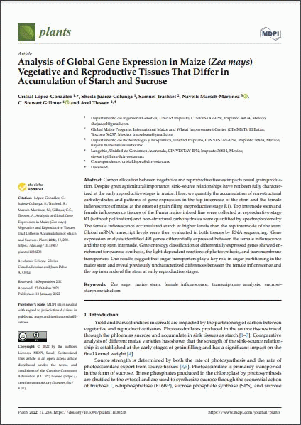 Subject(s): Online resources: In: Plants Basel (Switzerland) : MDPI, 2022 v. 11, no. 3, art. 238Summary: Carbon allocation between vegetative and reproductive tissues impacts cereal grain production. Despite great agricultural importance, sink–source relationships have not been fully characterized at the early reproductive stages in maize. Here, we quantify the accumulation of non-structural carbohydrates and patterns of gene expression in the top internode of the stem and the female inflorescence of maize at the onset of grain filling (reproductive stage R1). Top internode stem and female inflorescence tissues of the Puma maize inbred line were collected at reproductive stage R1 (without pollination) and non-structural carbohydrates were quantified by spectrophotometry. The female inflorescence accumulated starch at higher levels than the top internode of the stem. Global mRNA transcript levels were then evaluated in both tissues by RNA sequencing. Gene expression analysis identified 491 genes differentially expressed between the female inflorescence and the top stem internode. Gene ontology classification of differentially expressed genes showed enrichment for sucrose synthesis, the light-dependent reactions of photosynthesis, and transmembrane transporters. Our results suggest that sugar transporters play a key role in sugar partitioning in the maize stem and reveal previously uncharacterized differences between the female inflorescence and the top internode of the stem at early reproductive stages.