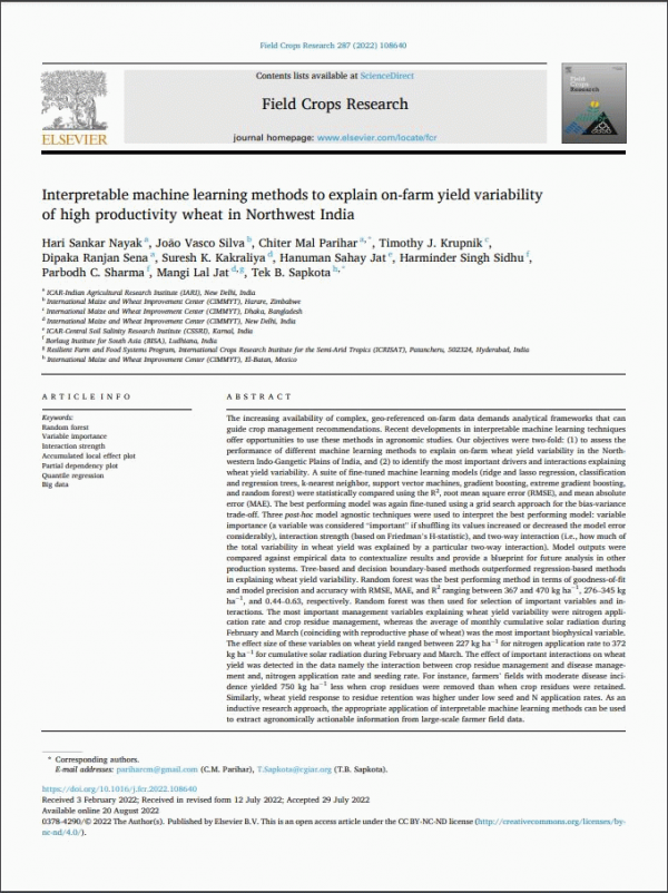 Subject(s): Online resources: In: Field Crops Research Amsterdam (Netherlands) : Elsevier, 2022. v. 287, art. 108640Summary: The increasing availability of complex, geo-referenced on-farm data demands analytical frameworks that can guide crop management recommendations. Recent developments in interpretable machine learning techniques offer opportunities to use these methods in agronomic studies. Our objectives were two-fold: (1) to assess the performance of different machine learning methods to explain on-farm wheat yield variability in the Northwestern Indo-Gangetic Plains of India, and (2) to identify the most important drivers and interactions explaining wheat yield variability. A suite of fine-tuned machine learning models (ridge and lasso regression, classification and regression trees, k-nearest neighbor, support vector machines, gradient boosting, extreme gradient boosting, and random forest) were statistically compared using the R2, root mean square error (RMSE), and mean absolute error (MAE). The best performing model was again fine-tuned using a grid search approach for the bias-variance trade-off. Three post-hoc model agnostic techniques were used to interpret the best performing model: variable importance (a variable was considered “important” if shuffling its values increased or decreased the model error considerably), interaction strength (based on Friedman’s H-statistic), and two-way interaction (i.e., how much of the total variability in wheat yield was explained by a particular two-way interaction). Model outputs were compared against empirical data to contextualize results and provide a blueprint for future analysis in other production systems. Tree-based and decision boundary-based methods outperformed regression-based methods in explaining wheat yield variability. Random forest was the best performing method in terms of goodness-of-fit and model precision and accuracy with RMSE, MAE, and R2 ranging between 367 and 470 kg ha−1, 276–345 kg ha−1, and 0.44–0.63, respectively. Random forest was then used for selection of important variables and interactions. The most important management variables explaining wheat yield variability were nitrogen application rate and crop residue management, whereas the average of monthly cumulative solar radiation during February and March (coinciding with reproductive phase of wheat) was the most important biophysical variable. The effect size of these variables on wheat yield ranged between 227 kg ha−1 for nitrogen application rate to 372 kg ha−1 for cumulative solar radiation during February and March. The effect of important interactions on wheat yield was detected in the data namely the interaction between crop residue management and disease management and, nitrogen application rate and seeding rate. For instance, farmers’ fields with moderate disease incidence yielded 750 kg ha−1 less when crop residues were removed than when crop residues were retained. Similarly, wheat yield response to residue retention was higher under low seed and N application rates. As an inductive research approach, the appropriate application of interpretable machine learning methods can be used to extract agronomically actionable information from large-scale farmer field data.