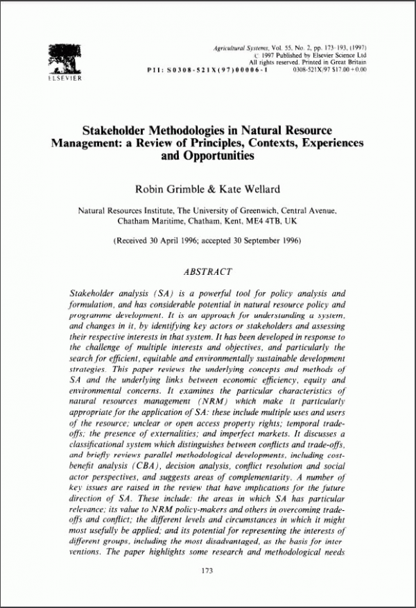 Stakeholder analysis (SA) is a powerful tool for policy analysis and formulation, and has considerable potential in natural resource policy and programme development. It is an approach for understanding a system, and changes in it, by identifying key actors or stakeholders and assessing their respective interests in that system. It has been developed in response to the challenge of multiple interests and objectives, and particularly the search for efficient, equitable and environmentally sustainable development strategies. This paper reviews the underlying concepts and methods of SA and the underlying links between economic efficiency, equity and environmental concerns. It examines the particular characteristics of natural resources management (NRM) which make it particularly appropriate for the application of SA: these include multiple uses and users of the resource; unclear or open access property rights; temporal trade-offs; the presence of externalities; and imperfect markets. It discusses a classificational system which distinguishes between conflicts and trade-offs, and briefly reviews parallel methodological developments, including cost-benefit analysis (CBA), decision analysis, conflict resolution and social actor perspectives, and suggests areas of complementarity. A number of key issues are raised in the review that have implications for the future direction of SA. These include: the areas in which SA has particular relevance; its value to NRM policy-makers and others in overcoming trade-offs and conflict; the different levels and circumstances in which it might most usefully be applied; and its potential for representing the interests of different groups, including the most disadvantaged, as the basis for interventions. The paper highlights some research and methodological needs directly relevant to natural resource managers and intended beneficiaries, namely: (a) acquiring empirical knowledge and understanding of the key stakeholders involved in the process and the factors governing their resource allocation procedures; (b) developing improved systems, frameworks and methodologies for analysing situations and incorporating stakeholder and institutional concerns; (c) developing knowledge of the opportunities and scope for action by policy-makers and facilitators in the design of interventions and the resolution of conflicts.