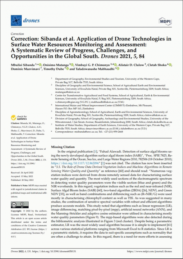 Correction : Sibanda et al. Application of Drone Technologies in Surface Water Resources Monitoring and Assessment: A Systematic Review of Progress, Challenges, and Opportunities in the Global South. Drones 2021, 5, 84