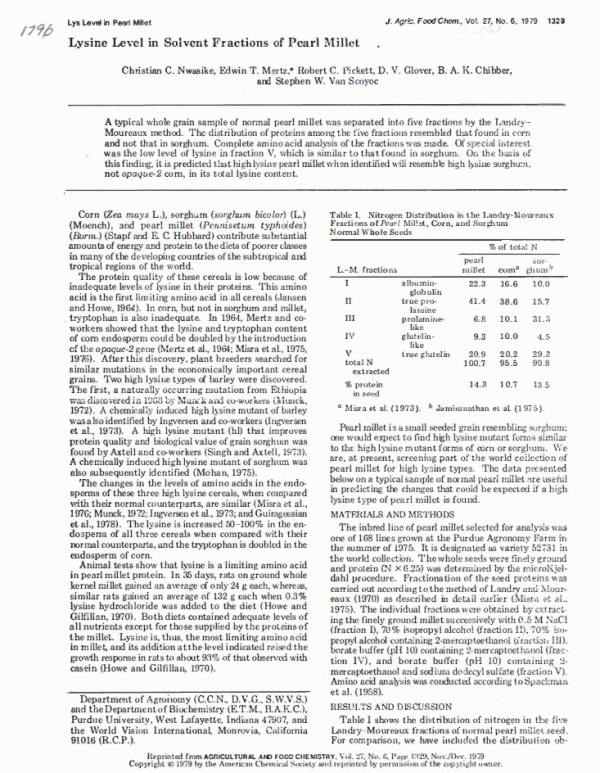 A typical whole grain sample of normal pearl millet was separated into five fractions by the Landry-Moureaux method. The distribution of proteins among the five fractions resembled that found in corn and not that in sorghum. Complete amino acid analysis of the fractions was made. Of special interest was the low level of lysine in fraction V , which is similar to that found in sorghum. On the basis of this finding, it is predicted that high lysine pearl millet when identified ½'ill resemble high lysine sorghum, not opaque-2 corn, in its total lysine content.