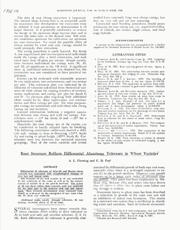 Differential Al tolerance of Atlas 66 and Monon wheat varieties was associated with morphological damage of root tips and lateral roots. The response of the root systems to Al was controlled by the sensitivity of the roots, as well as by the concentration of soluble Al in the growth medium. The action of Al was local rather than systemic, and was restricted for the most part to the sensitive root tips and lateral roots. More resistant meristematic areas remained functional, as evidenced by the emergence of new roots when the Al stress was removed.